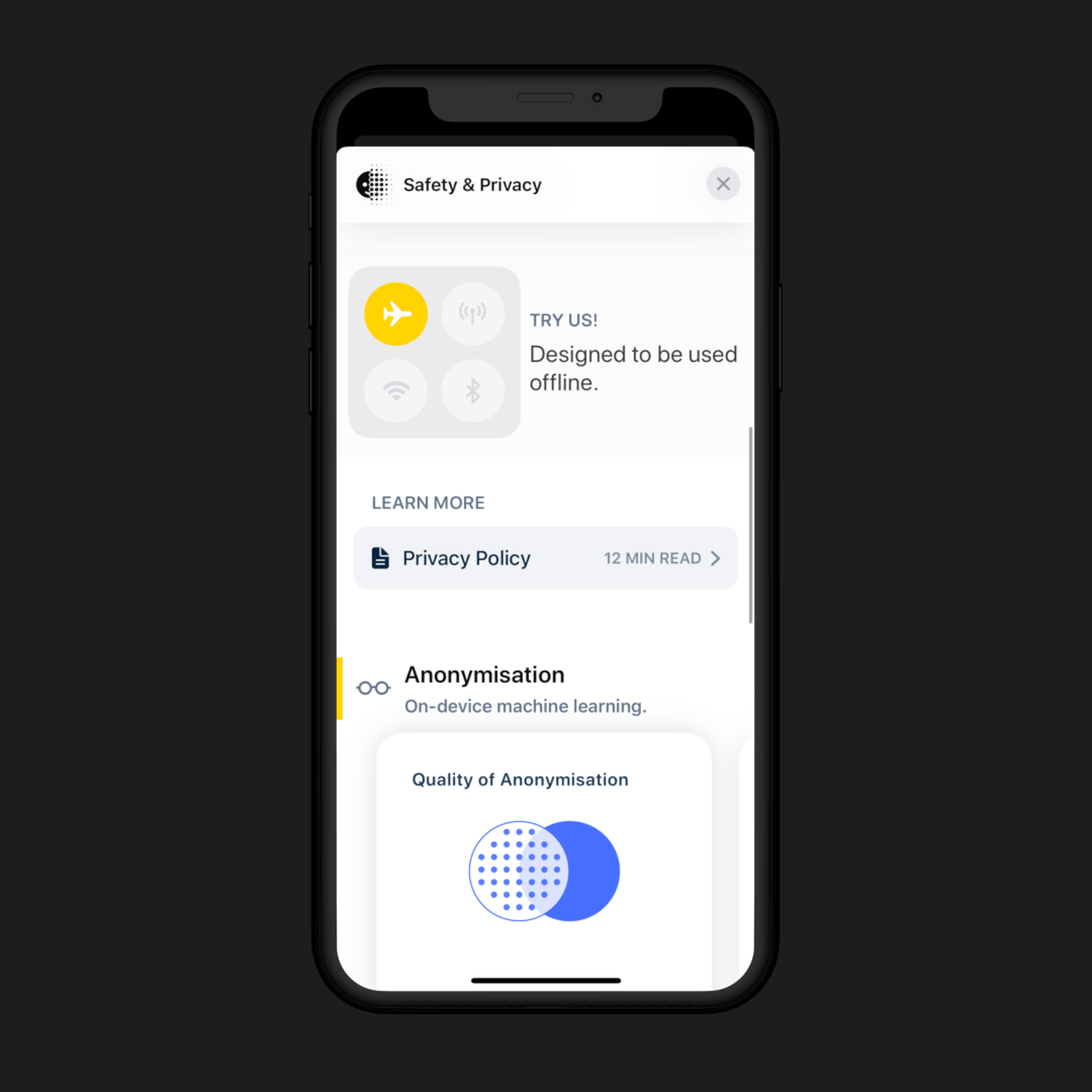 We created a "Safety & Privacy" section in the app that was used to help users understand the tech behind the tool and how their data was handled.