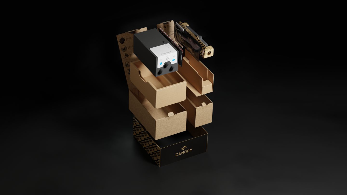 Packaging design and setup instructions for the Canopy unit.